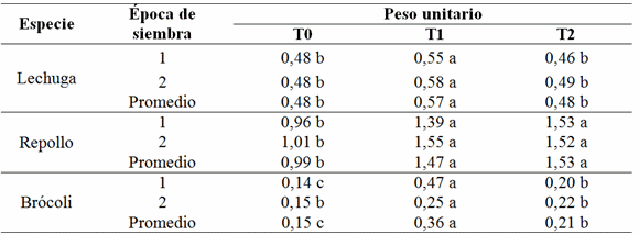 Tabla 2. Peso unitario (kg) de lechuga, repollo y brócoli cultivados con sistemas de riego por goteo y sistema de riego por exudación en dos épocas de siembra.