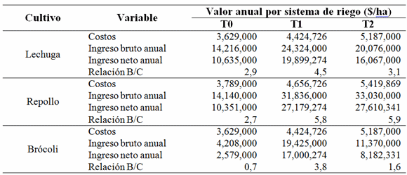 De acuerdo con los resultados obtenidos, se pudo establecer que el tratamiento de riego por goteo presentó mayor relación B/C para los cultivos de lechuga y brócoli, mientras que con el sistema de exudación en cultivo de repollo se obtuvo la mayor relación B/C (Tabla 3). Así, para los cultivos de lechuga y brócoli, el riego por goteo puede ser una entrada de gestión fundamental para garantizar el estado óptimo de humedad en el suelo, debido a que proporciona a cada planta la cantidad de agua que necesita para su normal crecimiento y desarrollo, lo que conlleva al óptimo rendimiento, eficiencia en el uso del agua y beneficios económicos según lo indican De Oliveira et al. (2016).