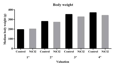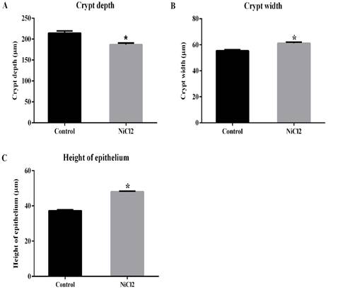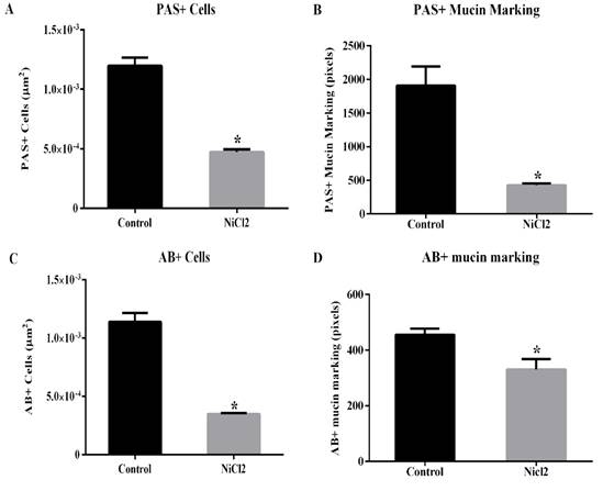 The ingestion of considerable amounts of water or food contaminated with nickel can be very toxic. The present work was conducted aiming to evaluate the effects of nickel exposures on ascending colon of adult Wistar male rats at hystometric level. We used 12 animals that were divided in a control (ingested uncontaminated water) and a nickel-contaminated (i.e., 25 mg de nickel/L of water) groups. Nickel chloride was offered in declorinated water and the experiment had a 56 days exposure period. A portion of the ascending colon was removed of the animals and subjected to hystological labelling processes using blue toluidin (for general hystometric description), Alcian Blue (AB, for acid mucins) and periodic acid-Schiff (PAS) technique (for neutral mucins). The potential differences between groups were desgined by applying the Whitney test and t test (p < 0.05). The crypts were smaller for the nickel-contaminated group, even though these organism exhibited broader and higher crypts. Nickel-contaminated animals exhibited a smaller amount of calyceform cells with AB and PAS positive reactions as well as a less mucus quantities when compared with nickel-uncontaminated animals. Such reductions on the amount of calyceform cells with AB and PAS positive reactions may be related wiht the shallower crypts, which possibly reduced the synthesis and secretion of mucins, compromissing the functional aspects (e.g., lubrification and intestinal mucosa protection) of the nickel-contaminated large intestines. Interestingly, the wider and higher crypts and higher epithelium collumn on the nickel-contaminated animals may represent a relevant trade-off for the intestinal mucosa protection.