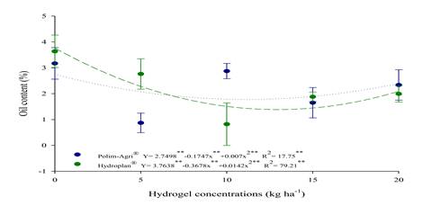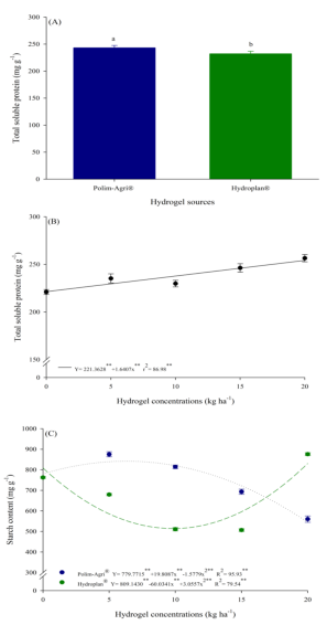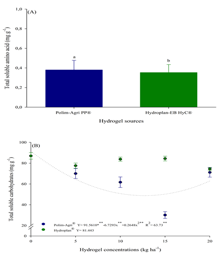 Investigations related to the effects of the hydrogel use in a water-deficit conditions on the biochemical composition of the harvested products are scarce. The aim of this study was to verify the influence of hydrogel on the biochemical response of cowpea beans produced under water-deficit in southern Tocantins. The experiment was a randomized complete block design with four replications. The treatments were obtained in a 2x5 factorial scheme, being: two sources of hydrogel (Hydroplan-EB HyC and Polim-Agri PP) and five concentrations (0, 5, 10, 15, and 20kg ha-1). After harvesting, the grains of cowpea, BRS Vinagre cultivar, were ground and chemically analyzed. The oil content of the seeds agreed with the reference values. The use of Polim-Agri PP promoted the best levels of amino acids (0.38mg g-1) and proteins (243.22mg g-1) of the grains. The carbohydrate content of them (Ȳ= 81.44mg g-1) was better using Hydroplan-EB HyC, regardless of the concentration applied. The application of 6.28kg ha-1 of Polim-Agri PP provided the highest starch content (842g mg-1). The use of hydrogel improves the biochemical quality of cowpea beans produced under water deficit in southern Tocantins.