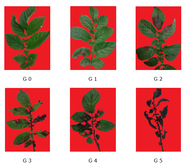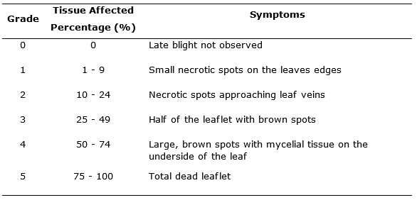 Forbes, G., Perez, W. & Andrade, J. (2014). Procedimiento para evaluación estándar y manejo de datos de clones avanzados de papa. Módulo 3: Evaluación de la resistencia en genotipos de papa a Phytophthora infestans bajo condiciones de campo. Guía para colaboradores internacionales. Perú: Centro internacional de la papa-CIP. 50p.