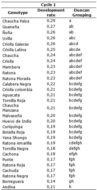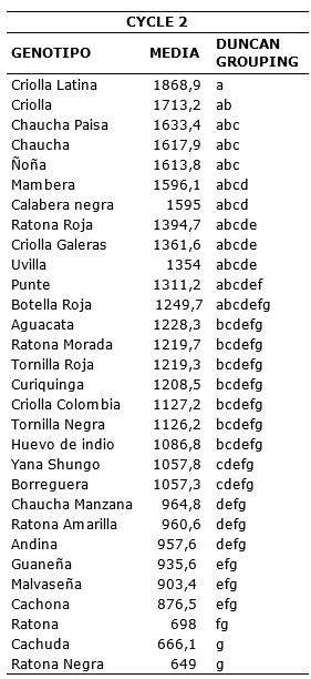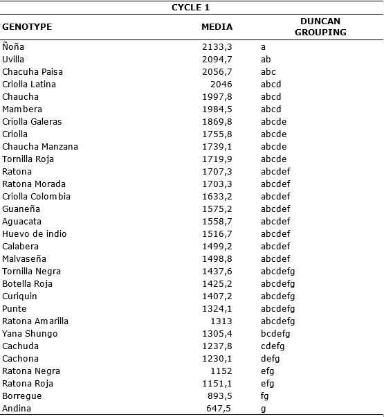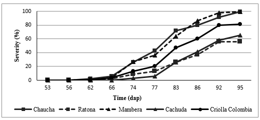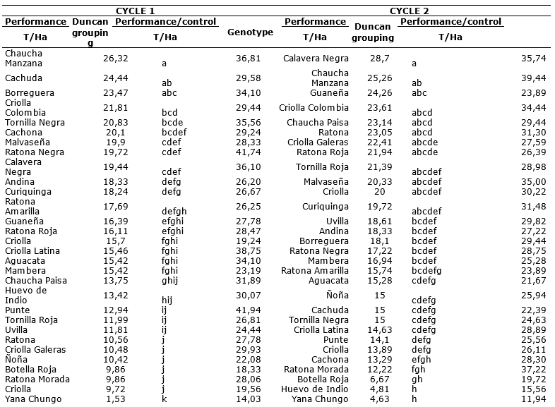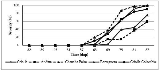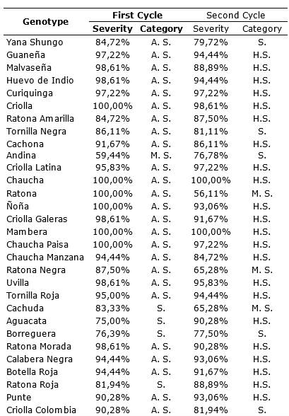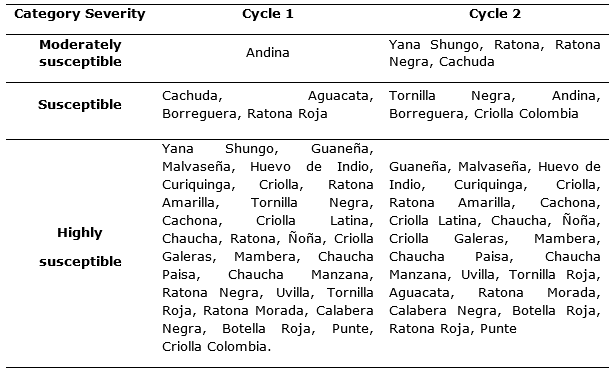 Potato crop is the fourth main food product in the world, but is affected by Phytophthora infestans, the late blight disease causal agent. This research was carried out in a town of Pasto high plateau, South of Colombia. In order to evaluate the reaction of different genotypes of creole potato (Solanum tuberosum groups Phureja and Andigena) with regard the disease. A Randomized Complete Block design was established with three repetitions, where 30 genotypes were distributed and three plants were evaluated per repetition during two crop cycles in natural exposure to the pathogen. To assess the disease effect on production, the same genotypes were maintained with chemical control in an adjacent batch. Genotypes classified as tolerant are Chaucha Manzana, Cachuda, Criolla Colombia, Malvaseña, Andina and Criolla, during the first cycle with performance values between 23 to 26t.ha-1 and during the second to Calavera Negra, Chaucha Paisa, Ratona, Criolla Galeras, Ratona Roja, Tornilla Roja and Aguacata with performance values between 23 to 28t.ha-1. The graphic severity scale allowed genotypes to be categorized as susceptible and highly susceptible. The results indicate that for the prevalent pathogen race in this study area, there are no resistance sources within the studied collection. However, genotypes such as Criolla Colombia and Andina showed a better performance in terms of yield.