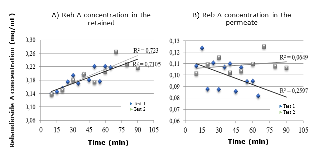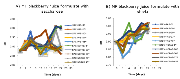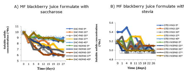 The modern consumer values those components that can promote their well-being and help them reduce the risk of diseases the use of steviolglucosides as a sweetener in the formulation of foods is promising. The study evaluated the tangential microfiltration for clarification and conservation of blackberry juice sweetened with dried leaves of stevia. Two ceramic membranes were evaluated. The tests were performed at 35°C in concentration mode at a constant transmembrane pressure and tangential velocity. The formulation of the juice was defined through sensory evaluation tests. Volume, flow permeate, temperature, and pressure input and output were registered. The results of the variables analyzed in the process, as well as the physicochemical characterization of clarified juice, helped define the operating conditions for draw two formulations of microfiltrated juice, sweetened with stevia or sucrose, and thus evaluate the effectiveness of microfiltration as a conservation treatment. Aciduric microorganisms were quantified; molds and yeasts were carried out in the generated pasteurized samples stored at five different temperatures (5, 20, 30, 37, and 45°C). The recovery permeate juice obtained was 84.62%. The permeate Flow (Jp), exhibited higher values at 40L/hm2. Also, the concentration of stevioside and rebaudioside A in the retentate increased with advancing ultrafiltration. A significant variation in color, turbidity, and soluble solids, was observed, unlike the pH. Also, its chemical and microbiological stability is confirmed that allows you to preserve quality during 27 days of storage.