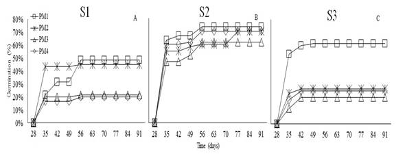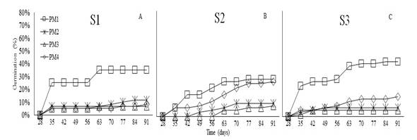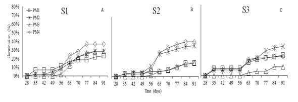 High Andean forests are strategic ecosystems with high diversity of native and endemic plants; however, these natural ecosystems are affected by agricultural expansion. Knowledge on the propagation of native plants is essential to restore these environments. This research aimed to evaluate germination in the following native species: Viburnum triphyllum Kunt. (Caprifoliaceae), Oreopanax floribundum Kunth, (Araliaceae), Weinmannia tomentosa L.f. (Cunoniaceae), and Tournefortia fuliginosa Benth. (Boraginaceae) in Botana experimental farm of Universidad de Nariño. This study was conducted between October (2016) and February (2017). For each species, an unrestricted randomized split-plot design was established. The main plot included the substrates (S), and the sub-plots included the different pre-germination treatments (PM) with three repetitions. The results showed statistically differences in germination percentage among pre-germination treatments for O. floribundum. The highest germination percentage (42%) for this species was achieved with seed imbibition for 48 hours at 22°C. Moreover, W. tomentosa showed statistical differences for S and PM, with a germination percentage of 74% with imbibition for 48 h at 22°C and sand substrate. T. fuliginosa did not show relevant differences; however, it had a germination percentage of 47%. V. triphyllum did not germinate; therefore, further evaluations of pre-germination treatments should be required.