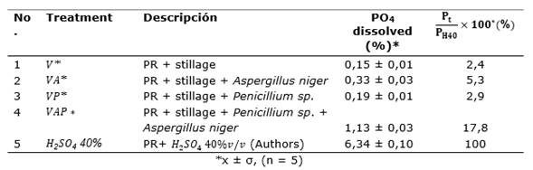 Phosphoric rock is the main source of phosphorus used in fertilizers. In most cases, it is applied alone or mixed with other nutrients in water; however, its low solubility means that it is not used efficiently, causing excess phosphorus to be wasted. As a result, it generates economic expenses to the farmer, or causing problems of eutrophication in water sources. In this article, different mixtures of solubilizing fungi with coffee pulp stillage were studied to improve phosphates’ solubility in phosphate rock. Despite that in different studies is clear the fungi’s role in P solubilization, its application on soils is still made without any additional treatment. Phosphoric rock samples were obtained from the municipality of Aipe (Huila) and were treated for 6 weeks with coffee pulp stillage (Coffea arabica) and inoculums of Aspergillus niger and Penicillium sp, pH and temperature controlled. The fungus species were obtained from environmental media on PDA culture, then it was isolated and identified on MEA culture according to standard morphologic identification methods. Aspergillus niger showed greater mycelial growth in the stillage and a higher concentration of phosphates dissolved in the aqueous phase (72 ± 31 M) compared to Penicillium sp. The mixture of the two fungi in the treatments allowed to obtain the highest percentage of phosphates (17.8% of the phosphate soluble in H2SO4 40% v / v).