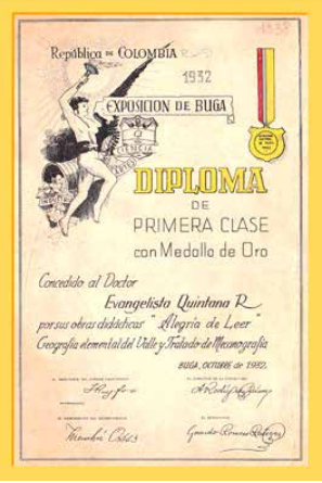 En las vacaciones escolares del mes de diciembre de 1926 el pedagogo señor Abraham Zúñiga P., hijo de la ciudad de Popayán, me puso en limpio con su gallarda letra dos cuadernos o libros de lectura elemental para destinarlos a la enseñanza de la niñez en esa disciplina, apuntes y cuadernos que conoció y alabó el insigne sabio y profesor doctor Decroly cuando vino al Gimnasio Moderno de Bogotá, en el mes de septiembre de 1925, cuyo concepto por demás honroso para mí se puede ver en mi diploma de maestro de escuela. Hechos esos trabajos, viajaba yo en ferrocarril de Popayán a la ciudad de Cali, en las vacaciones ya aludidas, mirando con interés y con deleite para mí, dichos cuadernos, cuando – un poco delante de la estación Morales – sentí que me pusieron las manos sobre mis hombros y volviendo yo a mirar hacia atrás vi que quien me llamaba la atención era el señor Evangelista Quintana, quien al momento me dijo: “Que lleva en sus manos?”. “Estos cuadernos”, le contesté. “Haber, muéstremelos”. Se me hizo caso muy duro darle una respuesta negativa y se los pasé. Este señor Quintana los ojeó y estudió detenida y ávidamente por largas horas desde ese instante, hasta la estación La Viga, muy cerca de la ciudad de Cali. Al devolvérmelos me dijo: “Yo le voy a ayudar a Ud., aprovechando mi amistad con el director de Educación y con mis demás amigos, para que Ud. pueda mejor cumplir con su deseo de publicar sus obras, que considero muy importantes”.