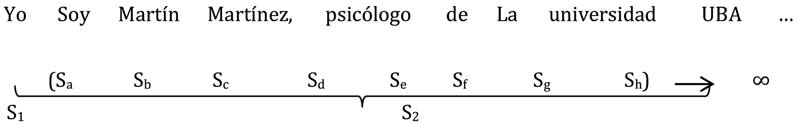 En el ejemplo de la Gráfica 2, un docente se presenta a sus estudiantes el primer día de clases. Si en el acto de habla dice solamente “Yo”, la significación queda incompleta; sus estudiantes no van a entender qué significa ese “Yo”. Por tanto, el docente agregará más significantes (S2) a este significante primero, con el fin de poder definir quién es. Para Lacan, el proceso de la significación se produce entre los significantes, no en cada uno de ellos y se da en efecto de retroacción, es decir, el último significante viene a dar sentido a los que le antecedieron. De este modo, el significante tiene primacía sobre el significado y la significación es un proceso que se da por la unión de los significantes; no se debe al significado como tal.