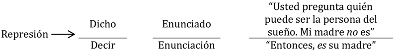 ¿Qué consecuencias trae esta concepción del sujeto y el lenguaje? Lacan demuestra que el sujeto se encuentra dividido entre lo dicho y el decir, entre enunciado y enunciación, lo que equivale a decir: el sujeto se divide entre la ordenación preconsciente que se hace en el acto del habla y el lecho subyacente de lo inconsciente en el lenguaje. En realidad, Freud encontró el fenómeno de división del sujeto mucho antes que Lacan, puesto que la escucha psicoanalítica le reveló que en la negación de sus pacientes sobre ciertos temas se encontraba una afirmación primordial, posteriormente negada en el plano consciente27. Freud ejemplifica la negación con el discurso de uno de sus pacientes: “Usted pregunta quién puede ser la persona del sueño. Mi madre no es”28. La pregunta que surge es: ¿por qué un paciente, al hablar sobre sus sueños y las personas que aparecen en ellos, escoge, de todas las personas del mundo, a su madre, para decir que no es ella? Freud concluye, en la más contundente evidencia, que efectivamente es la madre y ubica la presencia de la represión en la negación29. En este orden de ideas, Lacan retoma la negación de Freud para mostrar la división a la que se encuentra sometido el sujeto en el lenguaje, entre el dicho y el decir, o enunciado y enunciación30:
