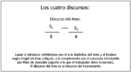 Lucero44 anota que el “discurso del amo”, incluidos los otros tres (“Analista, Histérica yUniversitario”), tienen sus bases en la célebre fórmula: “el inconsciente es el discurso del Otro”, esto significa que el inconsciente es el efecto de la palabra, del lenguaje sobre el sujeto; o podemos decir también que si un “viviente”, un sujeto de la necesidad no entra en el lenguaje para ser tomado por él, no tendría un inconsciente. Esta teoría resulta de gran utilidad a la hora de realizar una lectura del malestar posmoderno y así poder diferenciarlo de otras épocas. Esta diferencia parece recaer más sobre la forma de presentación del padecimiento, que delata la participación de la naturaleza de nuestra cultura actual.