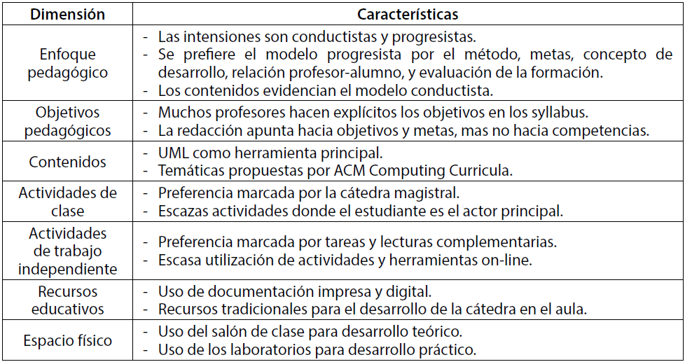 1. Elementos comunes de la enseñanza en computaciónLa investigación en cuestión presentó como resultado la creación de una didáctica específica para el curso de diseño de software en las disciplinas relacionadas al área de la computación. Realizando una síntesis sobre las conclusiones de la investigación, se puede observar un resumen a través de la tabla 1.