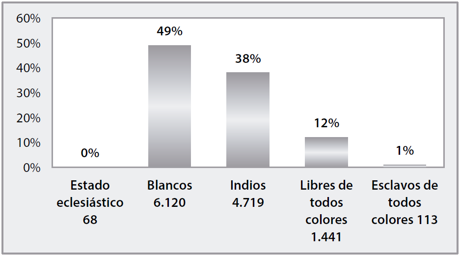 Esta gráfica permite poner en perspectiva las características de una configuración social fragmentada a partir de su origen étnico, en la que sobresalía la población blanca e indígena; el clero y la población esclava representaban menor proporción y, al tener en cuenta la importancia del origen étnico y el color, como elementos que permitían la clasificación social de la población, se puede reconocer la precensia de la población, que era resultado de la mezcla. Desde el punto de vista de la clase, Sergio Elias Ortiz afirmó que la presunción de superioridad de una clase sobre otra marcaba las distancias sociales; al respecto señaló: