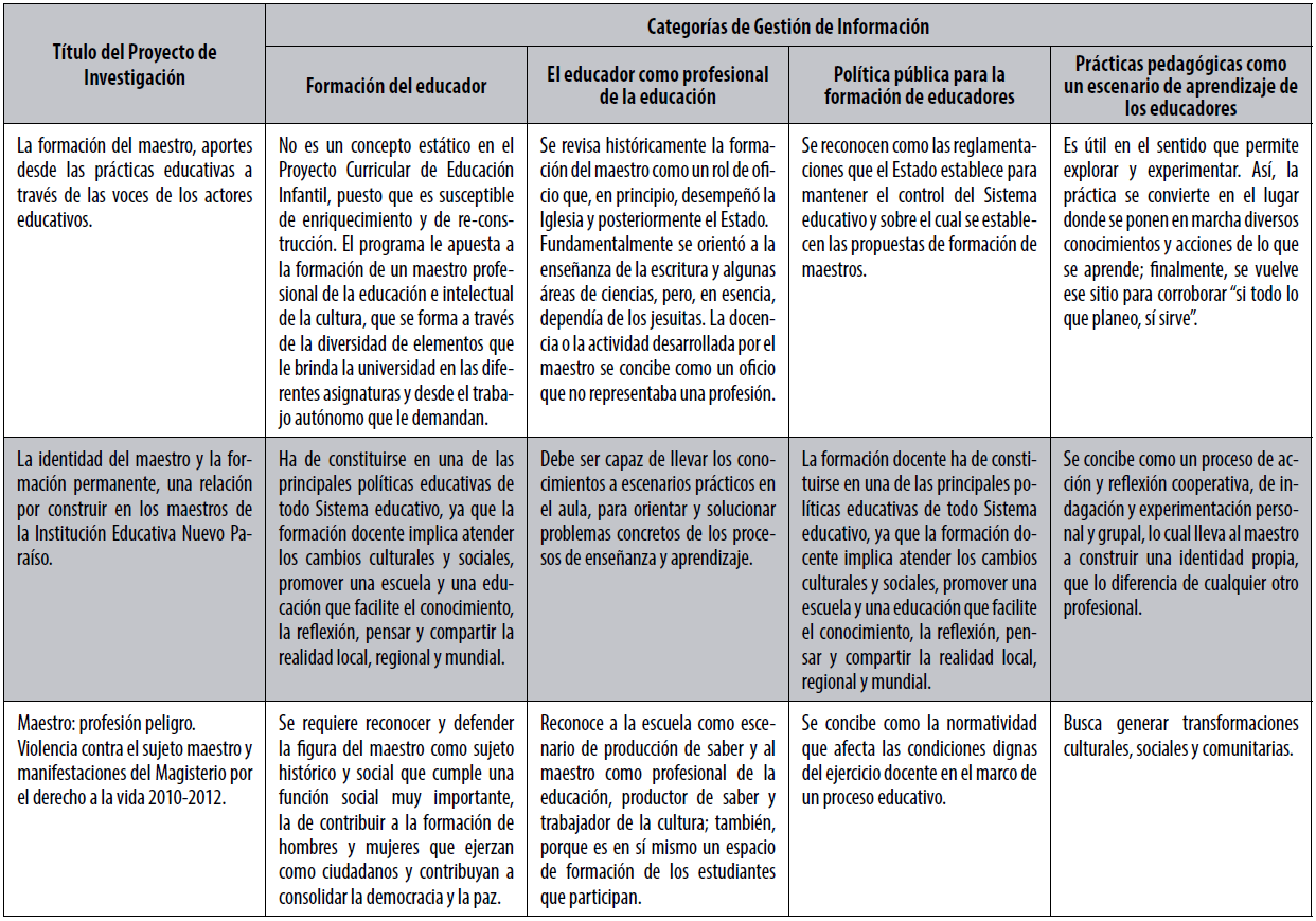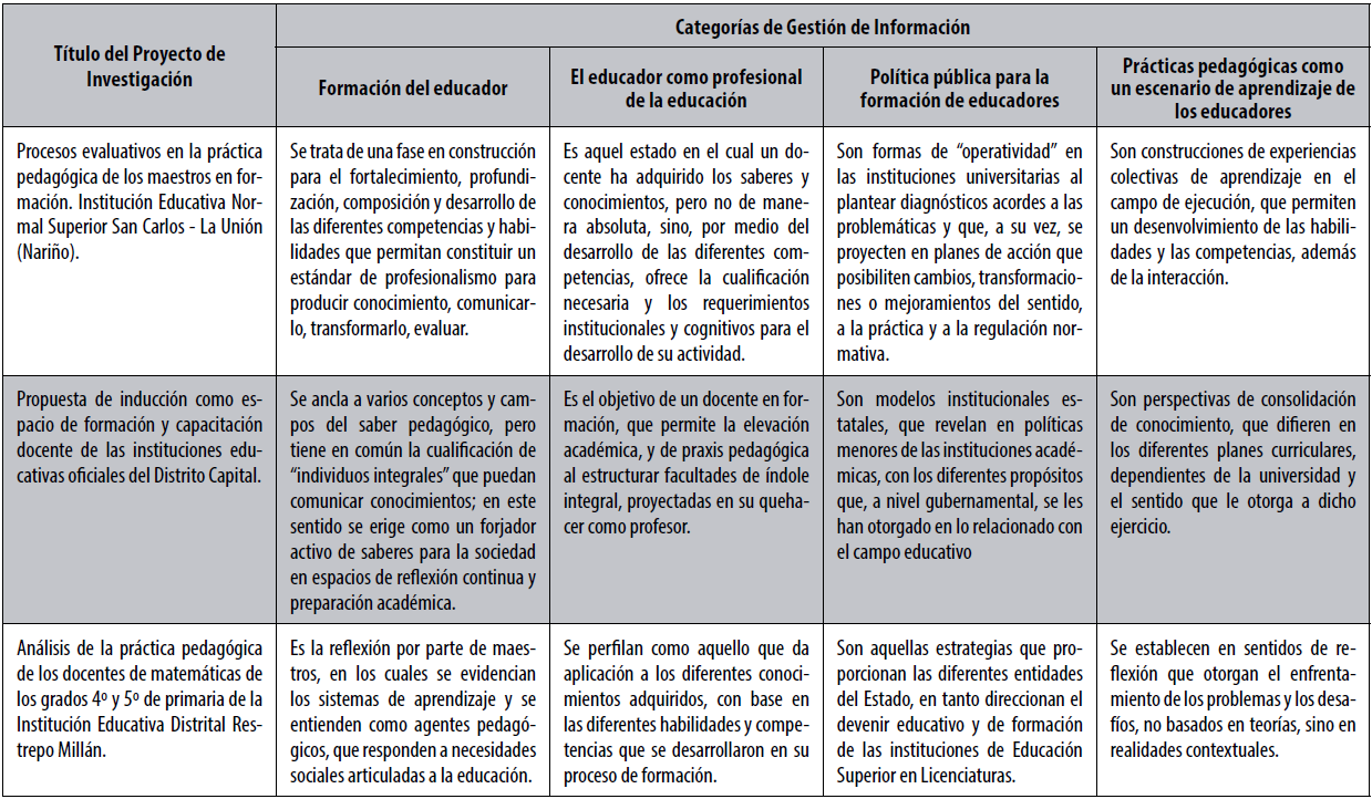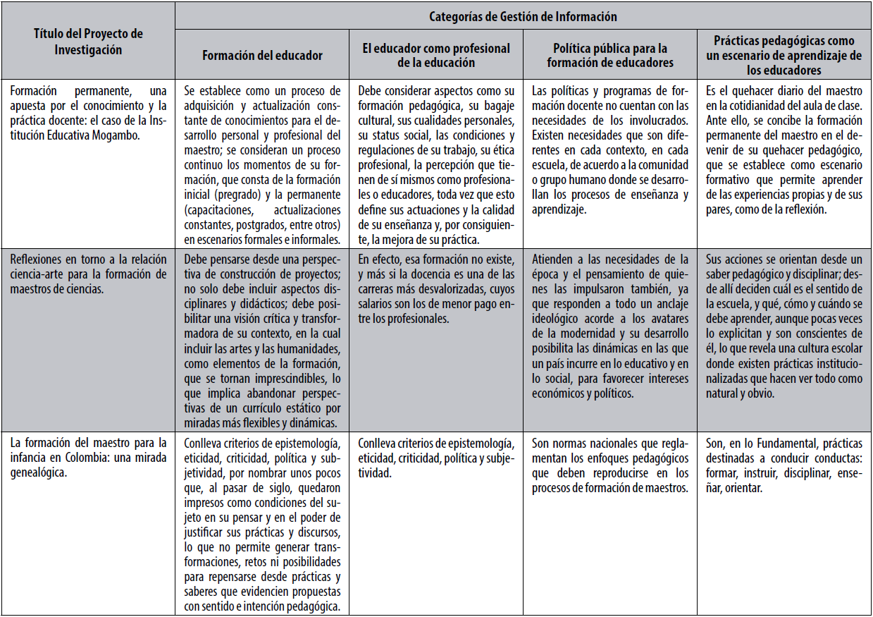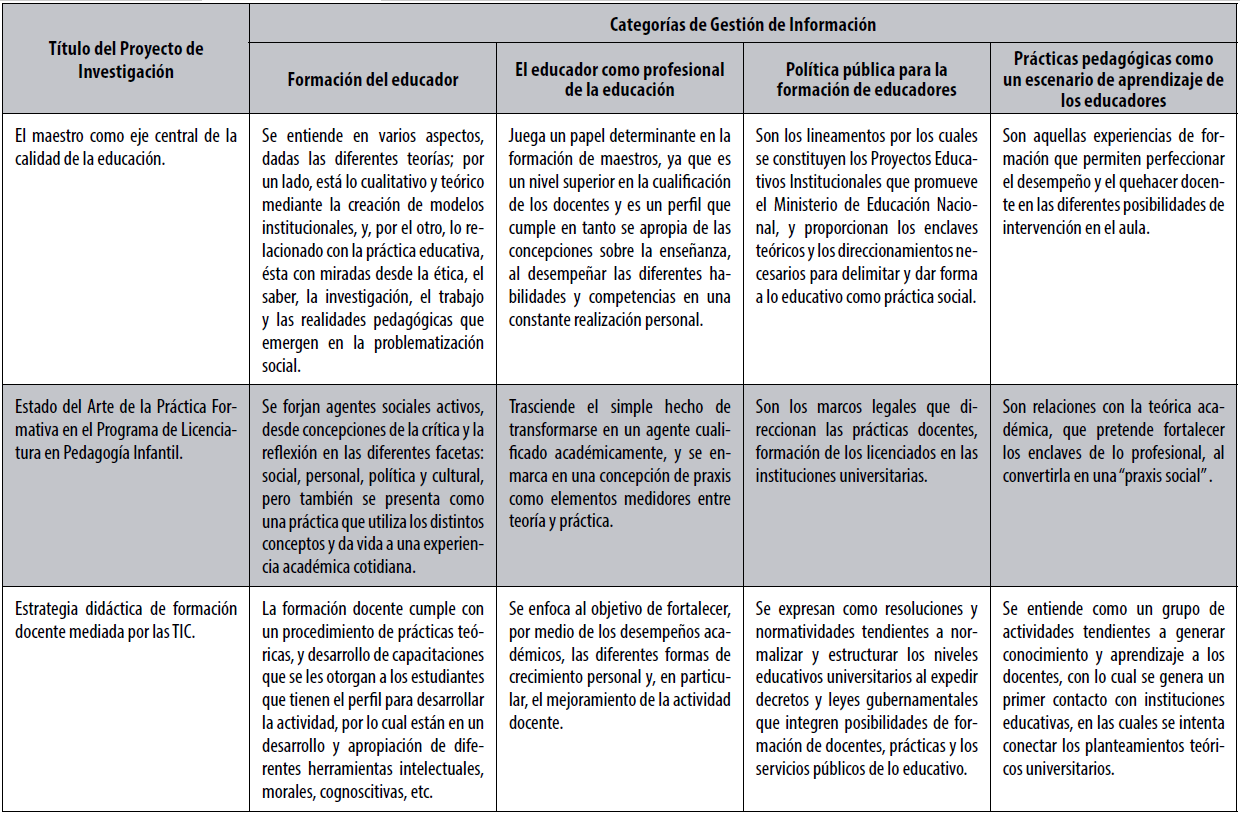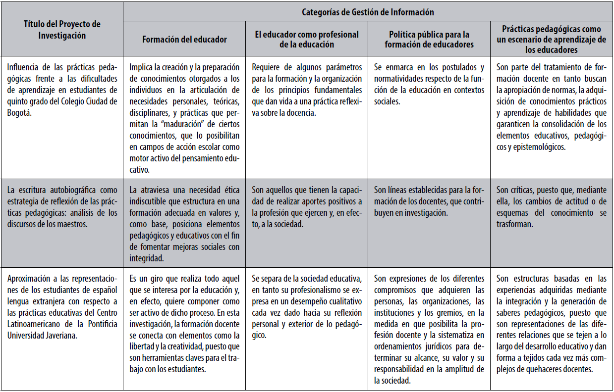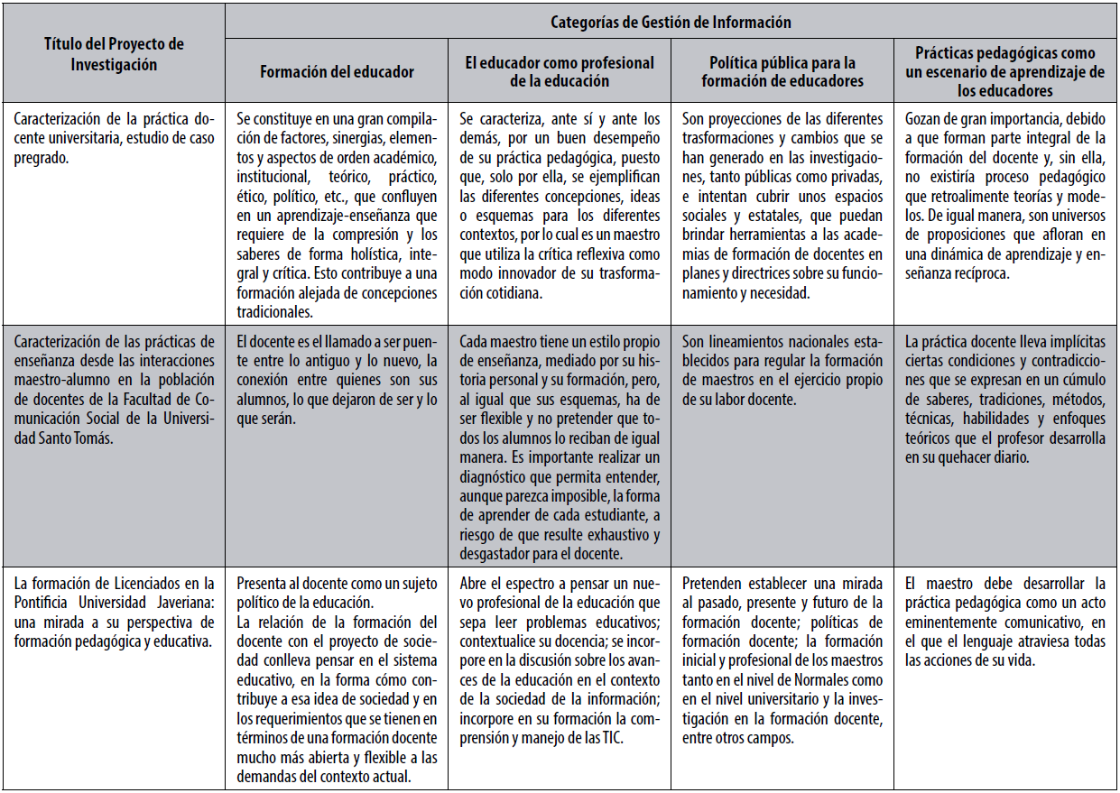 Para el desarrollo de la revisión documentación realizada con el propósito de consolidar el estado del arte sobre este tema, se estableció como ruta metodológica la identificación y posterior análisis de trabajos de investigación en el nivel de pregrado, maestría y tesis doctorales de las Universidades: Minuto de Dios, Católica de Manizales, La Sabana, de Antioquia, La Salle, Pedagógica Nacional, Javeriana, Pedagógica y Tecnológica de Colombia, San Buenaventura Sede Bogotá, Tecnológica de Pereira, instituciones educativas de Educación Superior que han abordado el tema de la formación de educadores y sus prácticas pedagógicas, que permitieron identificar aportes en relación con las categorías de gestión de información planteadas en el apartado anterior.