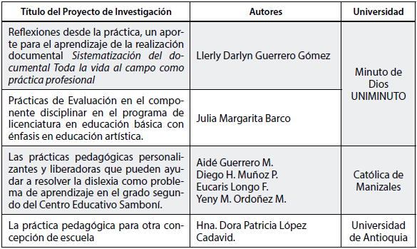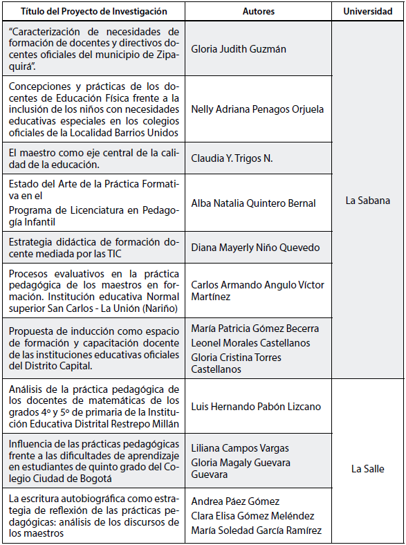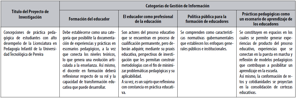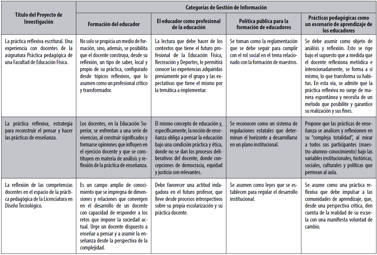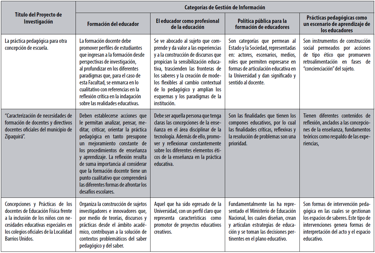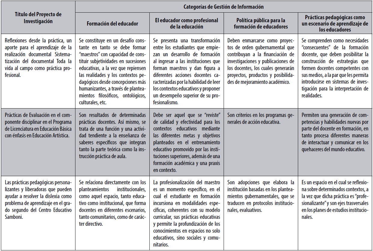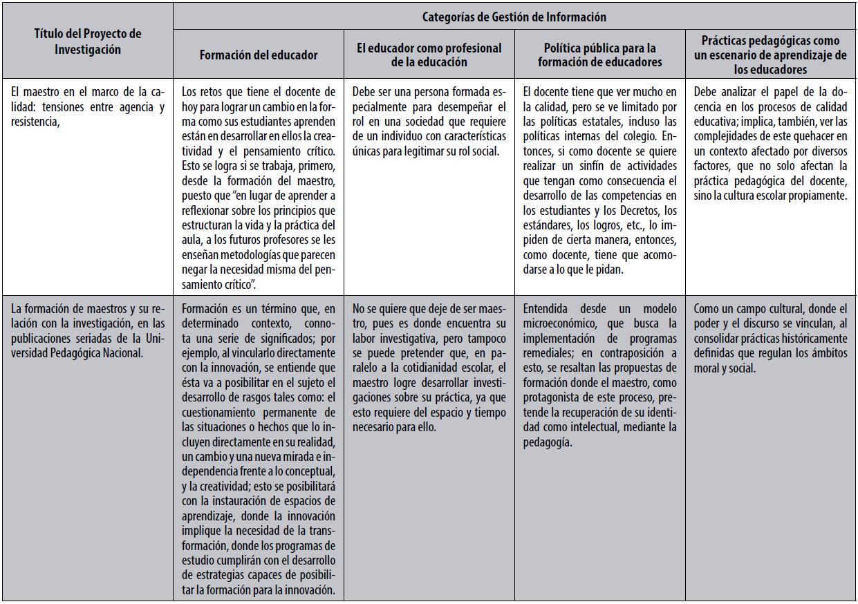Para el desarrollo de la revisión documentación realizada con el propósito de consolidar el estado del arte sobre este tema, se estableció como ruta metodológica la identificación y posterior análisis de trabajos de investigación en el nivel de pregrado, maestría y tesis doctorales de las Universidades: Minuto de Dios, Católica de Manizales, La Sabana, de Antioquia, La Salle, Pedagógica Nacional, Javeriana, Pedagógica y Tecnológica de Colombia, San Buenaventura Sede Bogotá, Tecnológica de Pereira, instituciones educativas de Educación Superior que han abordado el tema de la formación de educadores y sus prácticas pedagógicas, que permitieron identificar aportes en relación con las categorías de gestión de información planteadas en el apartado anterior.