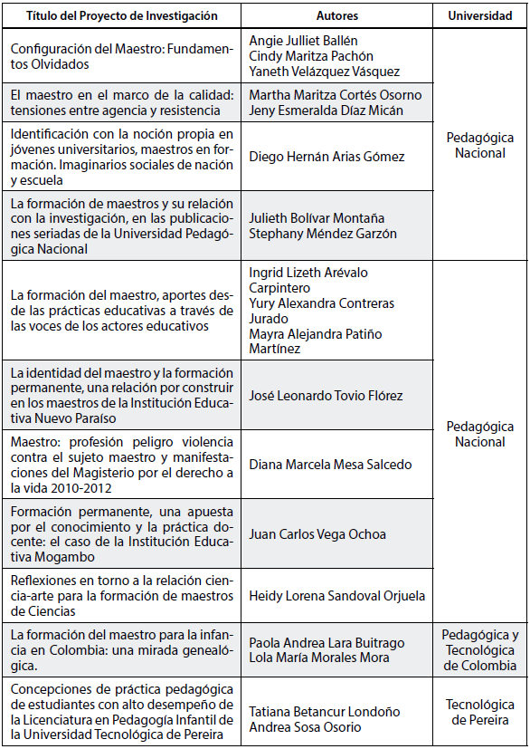 Al tomar como referencia el proceso documental realizado para la construcción del estado del arte sobre el tema abordado, se puede inferir que la investigación en el campo de la formación de educadores en Colombia presenta bajos niveles de desarrollo puesto que, al revisar los diferentes repositorios, bases de datos y bibliotecas con los que cuentan las diferentes universidades públicas y privadas, son pocos los proyectos que abordan el tema y, más aun, los que profundizan sobre los problemas que enfrenta la formación de educadores en el país.