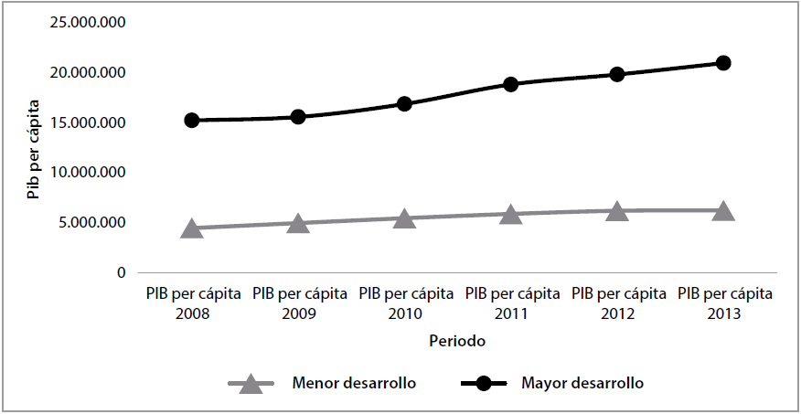 Gráfica 1. Comportamiento del PIB per cápita para las regiones desarrolladas y menos desarrolladas en Colombia durante el periodo 2008-2013.