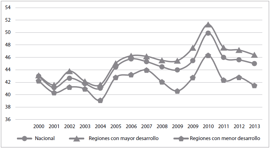 La Gráfica 2 evidencia el puntaje promedio en matemáticas de las regiones con mayor nivel de desarrollo, respecto al puntaje promedio de las regiones con menor nivel de desarrollo. Para todo el periodo de estudio, el puntaje promedio de las regiones con mayor nivel de desarrollo (45,3) se ubicó por encima de la media nacional (44,32), y del promedio de las regiones con menor nivel de desarrollo (42,18). Estos resultados muestran dos aspectos: