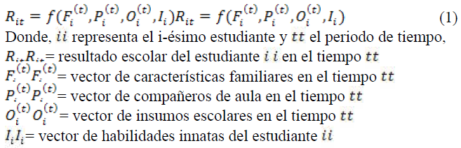 Para resolver el problema propuesto, se utilizó el enfoque teórico de la función de producción educativa que propuso inicialmente Hanusheck (1986), donde el resultado académico representa el producto obtenido a partir de la combinación de un grupo de factores productivos, representados por las características del estudiante, la familia y la escuela.