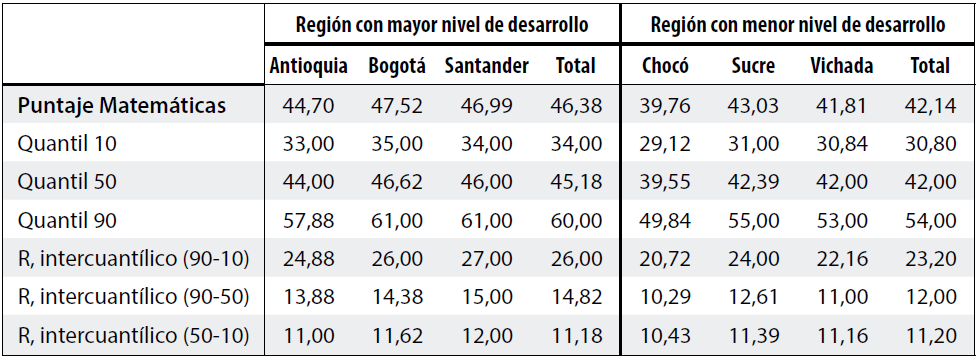 Para analizar la desigualdad del puntaje entre regiones, se generan tres rangos intercuantílicos:4 90-10, 90-50 y 50-10. El rango intercuantílico 90- 10 corresponde al intervalo entre el 10% de los mayores y menores puntajes obtenidos por los estudiantes; es decir, es una medida que puede resumir la dispersión en la distribución del rendimiento de matemáticas. Como se puede observar, las regiones con mayor nivel de desarrollo socioeconómico, con un rango de 26 puntos, son más desiguales. Por su parte, respecto al rango intercuantílico 90-50, que resume la distribución en el rendimiento de matemáticas del 10% de los estudiantes con mejores puntajes en relación con la media, las estimaciones muestran que nuevamente las regiones con mayor nivel de desarrollo socioeconómico, con un rango de 14,82 puntos, son más desiguales para la población con mejores puntajes.