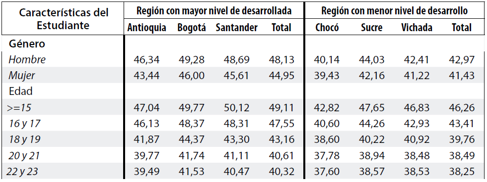 Los estudiantes de regiones con mayor nivel de desarrollo obtienen un 2,7% más de puntaje en matemáticas que los estudiantes de regiones con menor nivel de desarrollo. Con respecto a las características propias de los estudiantes, el puntaje de los varones en matemáticas es 5,7% más alto que el puntaje de las mujeres, resultado consistente con la evidencia empírica de países como Estados Unidos y otros países desarrollados. En las regiones con mayor nivel de desarrollo en Colombia, dicha diferencia se mantiene (5,8%), mientras que en las regiones con menor nivel de desarrollo esta diferencia tiende a disminuir (3,6%).