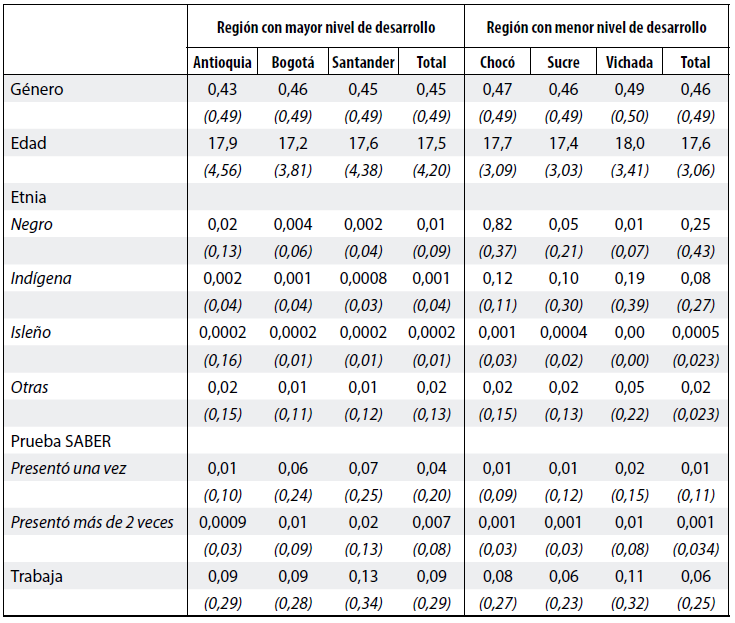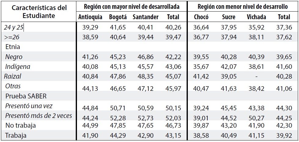 En cuanto a la etnia, ser raizal5, o pertenecer a otras razas, genera una brecha en el puntaje, entre regiones con mayor y menor nivel de desarrollo, de 4,79 (11%), y 4,91 puntos (11%) respectivamente, en que se destaca para ambas etnias el Departamento de Santander con un puntaje de 48,35 en los raizales y 47,12 para otras etnias. Con respecto al número de veces que se presentó la prueba, los resultados establecen que la brecha entre las regiones con mayor y menor nivel de desarrollo socioeconómico aumenta a medida que se presenta más veces la prueba. Como se esperaba, los estudiantes que trabajan presentan un puntaje promedio menor que aquellos estudiantes que no trabajan. Al comparar este resultado para las regiones con mayor y menor nivel de desarrollo, se encuentra que existe una discrepancia de 4,43 y 3,23 puntos respectivamente, entre los estudiantes que no trabajan y los que desempeñan alguna actividad laboral.