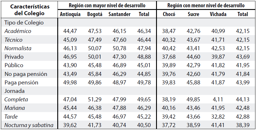 La evidencia empírica muestra que las características del colegio son un factor fundamental a la hora de explicar el rendimiento educativo de los estudiantes. La Tabla 3 presenta el puntaje promedio de matemáticas, según las características del colegio en las regiones con mayor y menor nivel de desarrollo socioeconómico durante el periodo analizado. Como se puede observar, las instituciones educativas normalistas son el tipo de colegio que presenta un mayor rendimiento en matemáticas en las dos regiones; sin embargo, existe una brecha de 5,8 puntos en favor de las regiones desarrolladas.