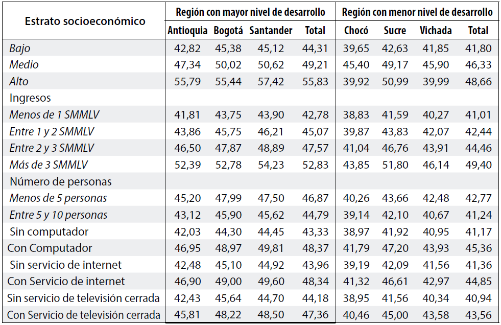 Las características económicas del hogar, tales como el ingreso familiar y estrato socioeconómico de la vivienda, presentan mayores impactos sobre el rendimiento de estudiantes de regiones con mayor nivel de desarrollo socioeconómico, pues la distribución de hogares con condiciones económicas más favorables es mayor en las regiones con mayor nivel de desarrollo.
