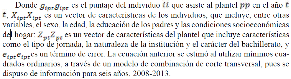 5. MODELO ECONOMÉTRICOCon el propósito de establecer cuáles son los principales determinantes del rendimiento académico en las regiones de mayor (Bogotá, Medellín y Santander) y menor (Chocó, Sucre y Vichada) nivel de desarrollo económico en Colombia, se utilizó el siguiente modelo lineal, inspirado en la función de producción educativa propuesta por Hanushek (1978):