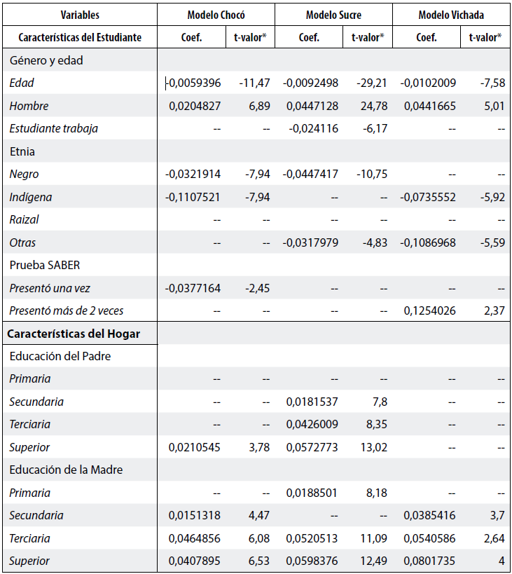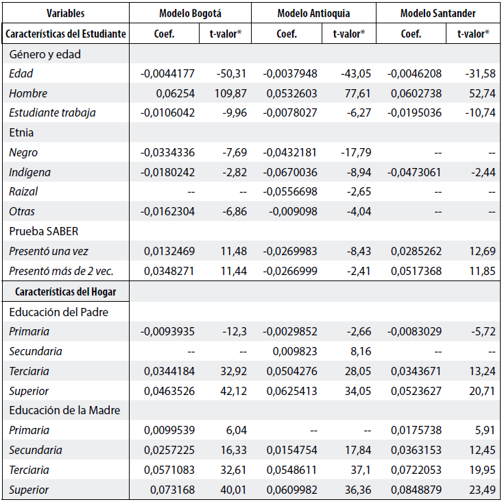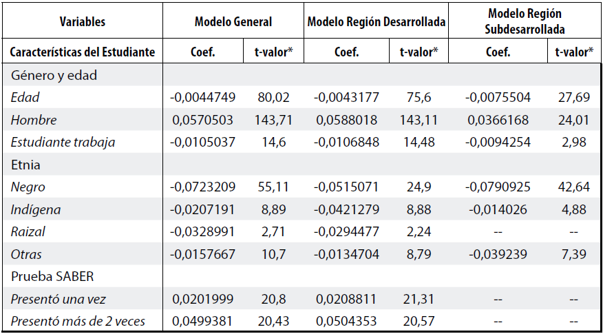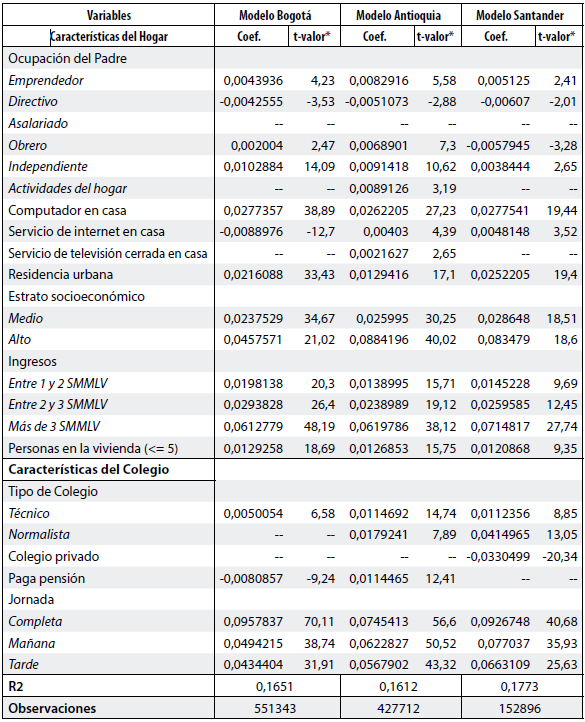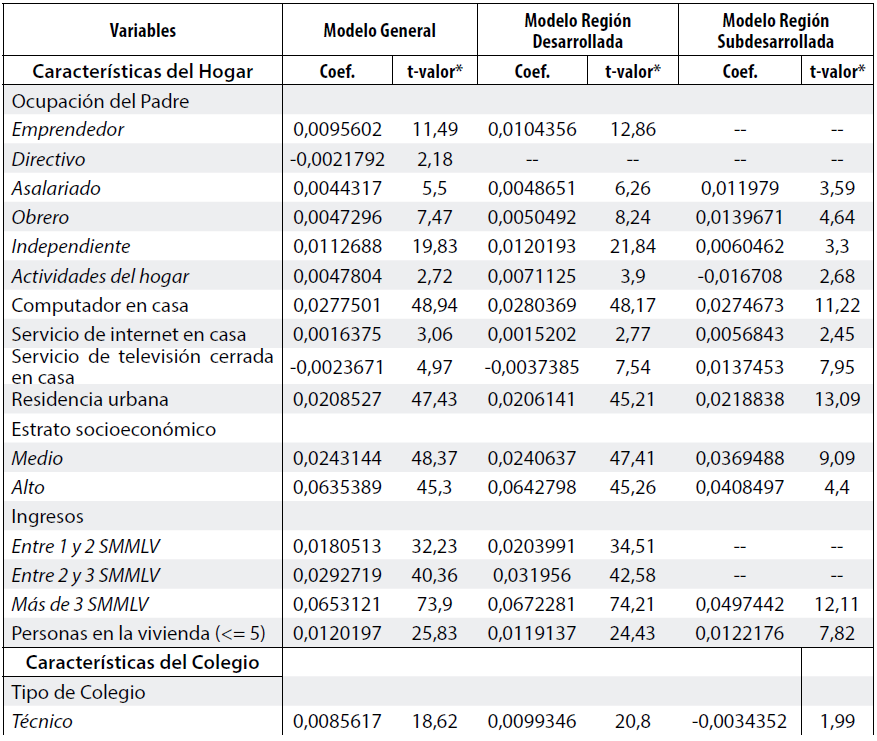 La siguiente tabla muestra la incidencia de los distintos factores en el puntaje de matemáticas en las pruebas Saber 11°. Se presentan tres modelos: 1) el modelo general, que incluye estudiantes de las dos regiones analizadas; 2) el modelo para la región con mayor nivel de desarrollo y 3) el modelo para la región con menor nivel de desarrollo.