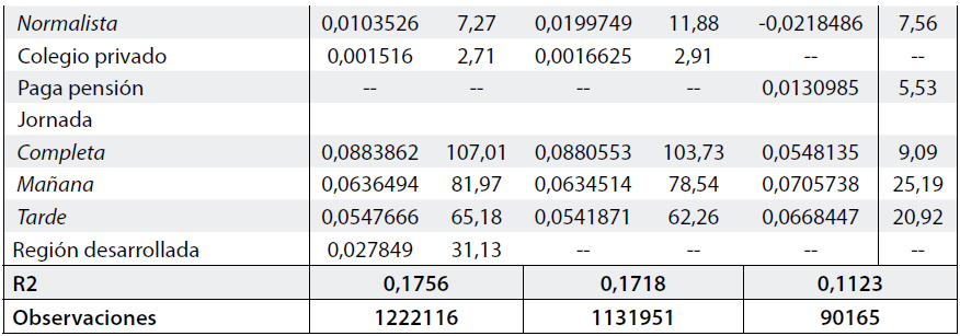 Con respecto a las características del colegio, la variable sector del colegio no presenta significancia estadística en las regiones con menor nivel de desarrollo socioeconómico, mientras que en las regiones con mayor nivel de desarrollo el efecto es significativo, pero relativamente pequeño. La jornada académica, es la característica del colegio que mayor efecto registra sobre el rendimiento académico; los colegios de la jornada de mañana y tarde tienen un mayor impacto sobre el rendimiento de estudiantes de regiones con menor nivel de desarrollo, mientras que los colegios de jornada completa tienen mayor impacto sobre el rendimiento académico de estudiantes de regiones con mayor nivel de desarrollo socioeconómico.