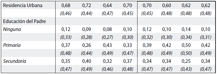 La Tabla 4 muestra el puntaje promedio de matemáticas, según las características del hogar, para ambas regiones durante el periodo 2008-2013. Como se observa, los estudiantes de regiones desarrolladas que viven en la zona urbana y rural tienen un 5% (2,10 puntos) y 13% (6,02 puntos) más de puntaje en relación con los estudiantes de las regiones con menor nivel de desarrollo.