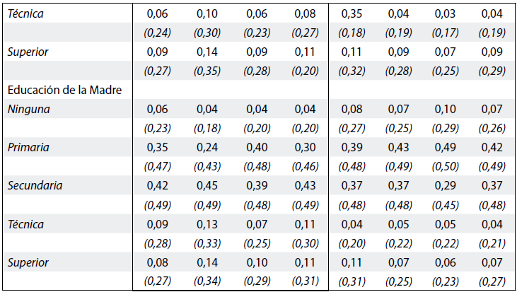 En cuanto a las características familiares y del hogar de los estudiantes, se encontró que los hijos de padre con educación terciaria y superior, obtienen un 4% y 5,2% más de puntaje que los hijos con padres sin escolaridad. La educación de la madre, por su parte, presenta un mayor efecto estadístico sobre el rendimiento académico de los hijos que la educación del padre. Los hijos con madre de Educación Superior obtienen un 7,3% más de puntaje que los hijos con madre sin escolaridad. En ambos casos, se observa que el impacto de la educación de los padres es mayor en las regiones con mayor nivel de desarrollo, aún después de controlar por las características del estudiante, del hogar y del colegio. Según Gaviria y Barrientos (2001), la conexión entre desempeño académico y educación de los padres puede darse a través de la calidad de los planteles educativos en los cuales matriculan a sus hijos, además de una mayor dotación de recursos tanto en la escuela como en el hogar (libros, computadores, viajes, etc.); esto es, padres con mejor nivel académico disponen de mayores recursos económicos, lo que les permite, a su vez, “comprar” una educación de mejor calidad para sus hijos.