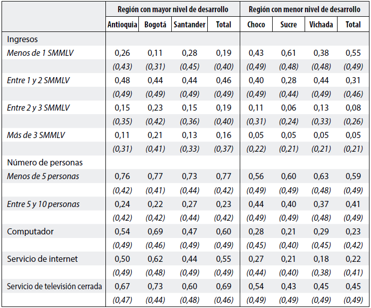 Con respecto a las características económicas del hogar, los estudiantes de hogares con ingresos económicos superiores a tres salarios mínimos legales vigentes obtienen un 6,53% más de puntaje en matemáticas que los estudiantes de hogares con menos de un salario mínimo. Aún después de controlar por las características del estudiante y el colegio, en las regiones con mayor nivel de desarrollo económico y social, los estudiantes de hogares con ingresos entre uno y dos salarios mínimos obtienen un 3,19% más de puntaje que los hogares con menos de un salario; en los ingresos superiores a tres salarios mínimos, los estudiantes obtienen un 6,72% más de puntaje que los estudiantes de menores ingresos. El efecto de los ingresos del hogar es significativo en las regiones con mayor nivel de desarrollo socioeconómico, mientras que en las regiones con menor nivel de desarrollo no se presenta significancia estadística.