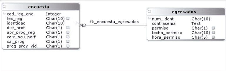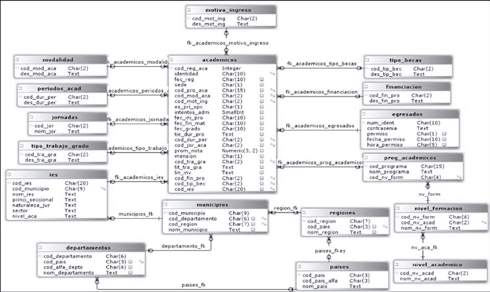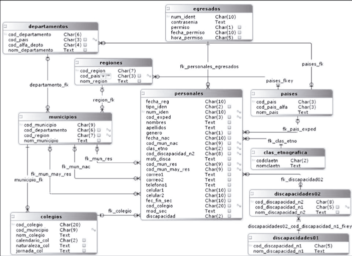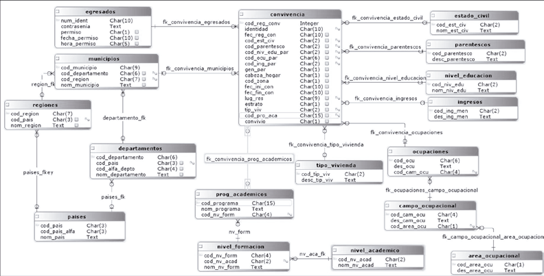 Del análisis de necesidades y en correspondencia con las exigencias del MEN sobre los egresados, se diseñó la Base de Datos dinámica, que tiene en cuenta datos personales, historial académico, historia laboral y datos de convivencia. Por otra parte, para la codificación de la mayoría de los ítems de soporte de la Base de datos, se investigó, consultó y adecuó codificación internacional, así: Datos de países, regiones y división política-geográfica, según el estándar internacional ISO 3166-1, 3166-2; para colegios e instituciones de educación de básica secundaria, se tomó la información ofrecida por Icfes y el DANE; en el caso de Programas académicos de pregrado y postgrado, se tomaron los datos del sitio Web del Ministerio de Educación Nacional.