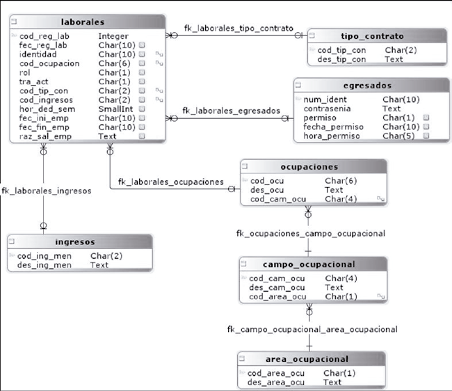 Para dar completitud a los datos personales de los egresados y con base en futuros estudios de “minería de datos”, se ve la necesidad de tener información de: motivo de ingreso, modalidad, tipo de financiación, tipo de becas, tipo de trabajo de grado, periodo académico, área ocupacional, campo ocupacional, cargos/ocupación, tipo de contrato, ingresos económicos, grupo étnico, estado civil, parentesco, convivencia, nivel educativo, tipo de vivienda y discapacidades. Para completar estos datos, la codificación de cargos y ocupaciones se tomó de la Clasificación de oficios del C.N.O. SENA 2007; la codificación para discapacidades se tomó del sitio Web discapacidadcolombia.com, basadas en el CIF de la Organización Mundial de la Salud, y la codificación de “Actividades económicas” se tomó de la Resolución 139 de 2012 – CIIU, versión 4 de la DIAN.