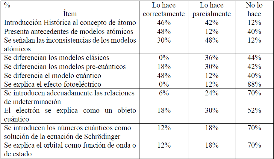 La presencia de errores conceptuales, en los LT, se ha analizado ampliamente, así como inexactitudes e incluso una mirada reduccionista sobre los temas expuestos.34 Con respeto a la los LT, si bien solo el 12 % de los textos analizados no hacen una presentación histórica de los modelos atómicos, de sus antecedentes, es importante enfatizar en que no se establece una clara diferenciación entre los modelos clásicos, pre-cuántico y cuántico, lo que permite contrastar una presentación reduccionista de este aspecto, ya que es importante la diferenciación para justificar el modelo cuántico, debido a que la estructura de la materia no se puede explicar desde la visión clásica.