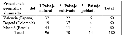 Las características geográficas del contexto en cada uno de los países son relevantes por cuanto pueden influir en los modelos de representación rural resultantes. En la provincia de Valencia, la muestra del alumnado de tercer curso de Educación Secundaria Obligatoria proviene de tres centros escolares ubicados en áreas rurales (Villar del Arzobispo), periurbanas (Torrent) y urbanas (la misma ciudad de Valencia). La selección de la muestra ha sido intencional, pero ha tenido en cuenta el contraste de modelos económicos y territoriales diferentes, que en el caso de la provincia de Valencia se encuadran en la Estrategia Territorial Valenciana 2030.44 En el caso de Bogotá los 60 alumnos y alumnas proceden del distrito de Cundinamarca, de donde hemos seleccionado dos centros: uno ubicado en una zona rural y montañosa, y el otro en territorio urbano. En lo que respecta a Brasil, la misma ciudad de Maceió ha permitido escoger a los 60 estudiantes en tres centros educativos de la región costera: dos de ellos en el barrio de Tabuleiro do Martins, con una economía centrada en los servicios y la instalación de empresas (como Petrobrás) dedicadas a la explotación de recursos naturales (agua, gas natural, petróleo…), y el tercero, en una zona más montañosa, próximo a la Universidad Federal de Alagoas. Aunque ninguno de los tres centros brasileños se ubica en áreas rurales o periurbanas, se ha comprobado que una parte del alumnado reside en áreas rurales de la parte más occidental de Maceió. Con este pretexto pasamos a exponer los resultados de los tres modelos de representación pictórica de los paisajes rurales.