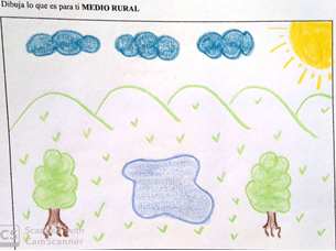 La mayoría de estas representaciones pictóricas guarda una estrecha equivalencia con la categoría de paisaje rural de otros estudios54, puesto que aunque no son frecuentes las personas que cultivan y construyen esos paisajes, se intuye la presencia humana en el desarrollo de la actividad económica. La diferencia estriba en el carácter más agrario o agropecuario que rural de esas representaciones, en las que no se ha registrado la actividad industrial o turística, propia de los territorios rurales en cualquiera de los tres países donde hemos seleccionado la muestra de estudiantes (Figura 3). En este caso concreto, la alumna ha expresado que su dibujo representa “una casa de hacienda, con un lugar para los animales, una plantación y un granjero”.