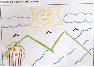 En definitiva, se puede decir que la mayoría de los esquemas mentales de esta primera categoría son fruto de una percepción en la que el paisaje rural queda representado por criterios morfológicos propios de un método descriptivo desarrollado por la ciencia geográfica durante el siglo XVIII y emanado de la confluencia de otros relatos procedentes de la literatura y el arte53. La mayoría de estos esquemas mentales no se corresponden con lugares reales que hayan sido visitados por el alumnado, lo que puede explicar que por influencia de una representación idealizada de estos paisajes se haya otorgado más importancia a lo estético que al contenido. Eso ha quedado patente en el grafismo convencional que ha plasmado el alumnado: el Sol ha sido representado como una o media esfera, el cielo abierto y ausente de contaminación en la parte superior del dibujo, la forma de uve para representar los pájaros y la nula representación del medio terrestre subaéreo (Figura 2). Estos ejemplos de elementos convencionales en el grafismo son recurrentes a los otros dos modelos de representaciones pictóricas, como se comprobará en los siguientes subapartados.