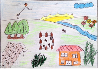 En el segundo modelo de representación pictórica se han conservado algunos elementos idealizados que siguen formando parte del escenario del paisaje rural, aunque la función productiva aparece como rasgo distintivo de los otros dos modelos. La representación aérea (Sol, nubes y cielo abierto) sobre un plano horizontal cerrado por superficies montañosas le sigue confiriendo cierto grado de idealización a estos dibujos, si bien es cierto que el mayor tamaño y la centralidad de las parcelas de cultivo, así como algunas instalaciones agropecuarias hacen que prevalezca el aspecto económico sobre el natural. A este segundo modelo se han adscrito 70 dibujos, de los que 37 corresponden al alumnado de Bogotá, en donde emerge con fuerte protagonismo la representación de las haciendas o fincas colombianas. Así lo ha expresado un alumno al afirmar que “este paisaje muestra la gran cantidad de biodiversidad que se encuentra en el campo, las flores, los animales y los cultivos que son los recursos naturales junto con el agua de nuestro país y la tierra”.