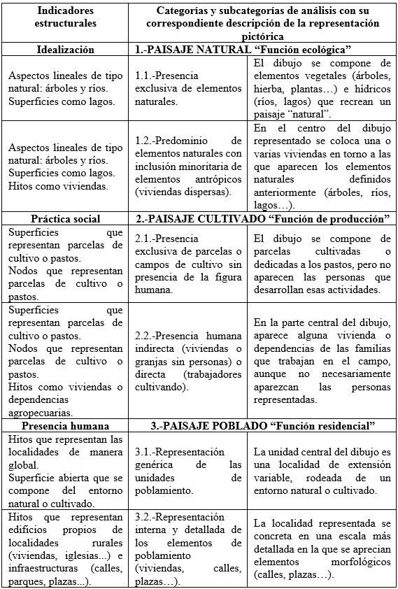 En consecuencia, el interés de los resultados de esta investigación radica en interpretar el sentido de las representaciones del paisaje rural para comprender las ideas que explican en los mapas mentales y la valoración que hacen de los espacios rurales respecto de la importancia que tienen en la actualidad. A través de su análisis se pretende dar respuesta a cuestiones como: ¿Cómo es el paisaje rural que ha representado el alumnado? ¿Qué atributos de criterio han representado en los paisajes rurales? ¿Son representaciones de espacios reales o idealizan aspectos naturales? ¿Qué funciones atribuyen a los paisajes rurales? Para ello hemos construido un sistema de categorías que permite clasificar las 180 representaciones del alumnado en tres modelos, a partir de la mixtura entre clasificaciones de autores que conciben el paisaje desde una posición más generalista37 y las funciones de la Carta Europea del Espacio Rural de 1996. Nuestro interés no recae en definir el tipo de paisaje, sino en diagnosticar el significado de la representación atribuida a cada uno de esos modelos. Los aspectos metodológicos de esos modelos se basan en la simplificación del modelo de Pocock,38 a los que se han unido tres niveles de representación (idealización, práctica social y presencia humana) que se corresponden con la trialéctica espacial39 interpretada desde la didáctica de la geografía.40 Las tres categorías espaciales de la mencionada Carta Europea del Espacio Rural se han definido en términos de paisaje41 y en plena concordancia con las tres concepciones del espacio (medio natural, espacio subjetivo y práctica social).42 Con esta categorización se distinguen los aspectos naturales de los relacionados con el aprovechamiento económico, pese a que otras investigaciones han demostrado las dificultades del alumnado para distinguir los cultivos de la vegetación natural.43 Así, la siguiente tabla (Tabla 1) recoge la categorización y sus indicadores, que serán analizados en el siguiente apartado.