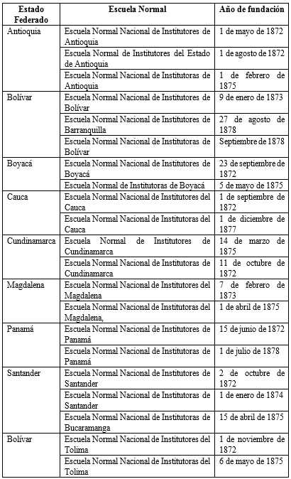 Para la apropiación del discurso pedagógico, el Estado contrató la primera misión pedagógica alemana, conformada por nueve pedagogos de altísimas cualidades, quienes se instalaron en diferentes Estados federados: Gotthold Weiss en Antioquia; Ernesto Hotschick, en Boyacá; Julio Wallner, en Bolívar; Augusto Pankou, en Cauca; Carlos Meisel en Magdalena, Ofrald Wirsing, en Panamá; Alberto Blume, en Cundinamarca; Gustavo Radlack, en Tolima y Carlos Uttermann, en Santander. La labor de estos pedagogos fue la de crear y dirigir una escuela normal y una elemental modelo, anexa a la normal.