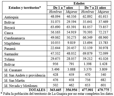 La siguiente tabla presenta la población de la República, resultado del Censo Nacional, discriminada por género y hasta los 21 años, por ser el objeto de este estudio.