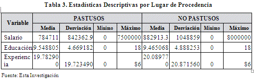 También se analiza que las personas oriundas de Pasto poseen menores ingresos, años de educación y experiencia promedios que las personas que no lo son. En este caso no se aprecia un efecto discriminatorio. Se observa por ejemplo una diferencia de casi $220.000 mensuales. (Ver tabla 3).