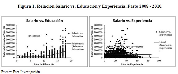 Conforme los datos de la investigación, tanto la educación como la experiencia muestran relaciones simples, en la misma dirección de estudios nacionales e internacionales. El salario guarda una relación directa con los años de educación y con la experiencia laboral, es decir, mayores años tanto de educación como de experiencia laboral generan un incremento positivo en el salario mensual de las personas. Sin embargo, este tipo de análisis gráfico de Mínimos Cuadrados Ordinarios (MCO) resulta insuficiente, entre otras razones, debido a la falta de controles y la posibilidad de sesgo (ver figura 1).