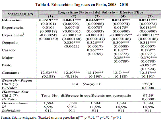 Los datos indican que de manera significativa estadísticamente, un año más de educación incrementa aproximadamente en 5,11% el ingreso de los pastusos. Este resultado es prácticamente invariable ante diferentes controles como ser casado, ser oriundo de Pasto, estar ocupado o pertenecer al género femenino. Cuando los datos se analizan por niveles de estudio, se encuentra que tener primaria completa reduce en aproximadamente un 12,3% el salario promedio mensual de las personas, mientras que tener estudios profesionales de pregrado o postgrado lo incrementa en un 34,7%. Asimismo, los datos reafirman la brecha salarial entre hombres y mujeres, dónde éstas devengan un 37,9% menos que los hombres, ratificando los datos de la Red ORMET en el 2013.