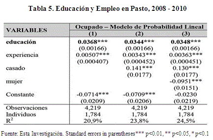 Esta investigación también pudo establecer, mediante estimación por Modelo de Probabilidad Lineal, que los años de educación resultan altamente significativos, estadísticamente hablando, a la hora de determinar la probabilidad de encontrar empleo en el municipio de Pasto, pues un año adicional de educación aumenta en 3,5% la probabilidad de estar ocupado. Así mismo, la experiencia laboral, estar casado y ser mujer también resultan ser significativas.