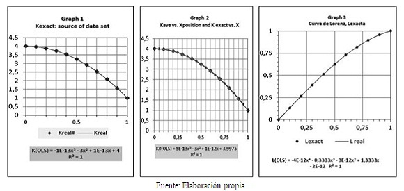 3) También la Gráfica 1 muestra el modelo de Mínimos Cuadrados para la función Curva de Lorenz, (L = – 5*(10–12) x4 – 0,3333 x3 – 6 *(10–12) x2 + 1,3333 x – 2*(10–12)), la que una vez simplificada de componentes insignificantes se convierte en: