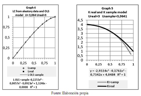 Ambas curvas de Lorenz, la real y la aleatoria son visualmente parecidas. Usando el método de mínimos cuadrados, OLS, las ecuaciones obtenidas de grado 4 resultan algo diferentes; pero si los valores de K de ellas se multiplican por la media respectiva de U=3real y de U=3.0641 entonces puede verse en la Gráfica 5 que los dos modelos son aproximados entre x=0 y x=0.65, y difieren en la cola baja a la derecha. Esta deformación para una muestra particular, fue causada por la aleatoriedad que alteró la media y la forma. Si usamos otra muestra de N=10 la deformación y el valor U distinto producen otras alteraciones distintas, pero en general, se observa que el ajuste entre el modelo y la realidad es aceptable pero imperfecto, aunque la muestra no sea muy representativa.