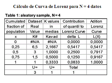 (X, L) = (i/N; S1i Ki/NU …. [3] … X es la fracción acumulada de población –que suele ir en el eje horizontal X y L es la participación –de la población acumulada X de más cuantía– en la masa total distribuida, para el ordenamiento descendente de la variable, aquí empleado. El Anexo 1 muestra un ejemplo numérico que parte de 4 datos y realiza el procedimiento explicado hasta ahora.