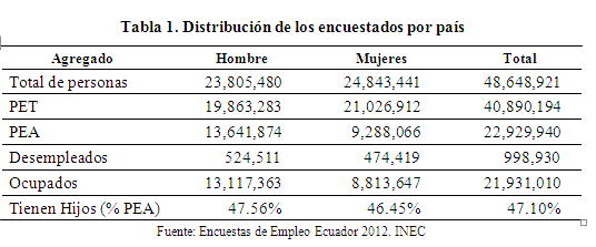 Los datos utilizados en el presente estudio se obtuvieron en términos trimestrales de la Encuesta de Empleo, desarrolladas por el Instituto Ecuatoriano de Estadísticas (INEC) del año 2012. La población total de la encuesta es de 191 mil personas con un rango total ajustado con factores de expansión a un poco más de 48 millones de personas. Con estos datos se puede separar a la población objeto del análisis, mostrándose los resultados en la tabla 1.